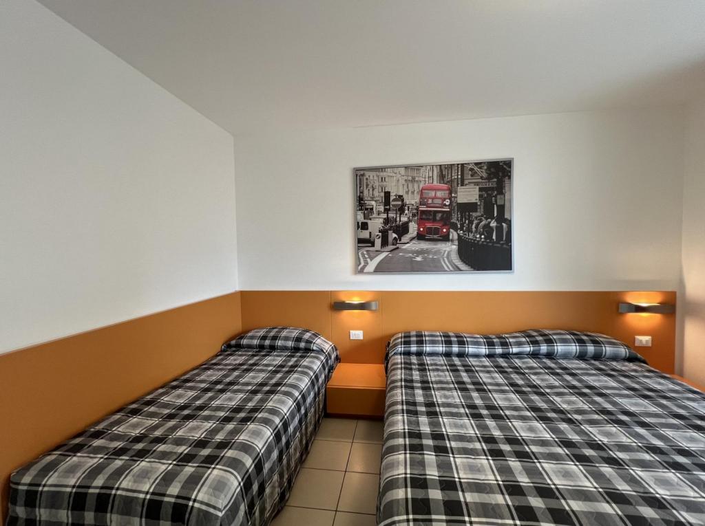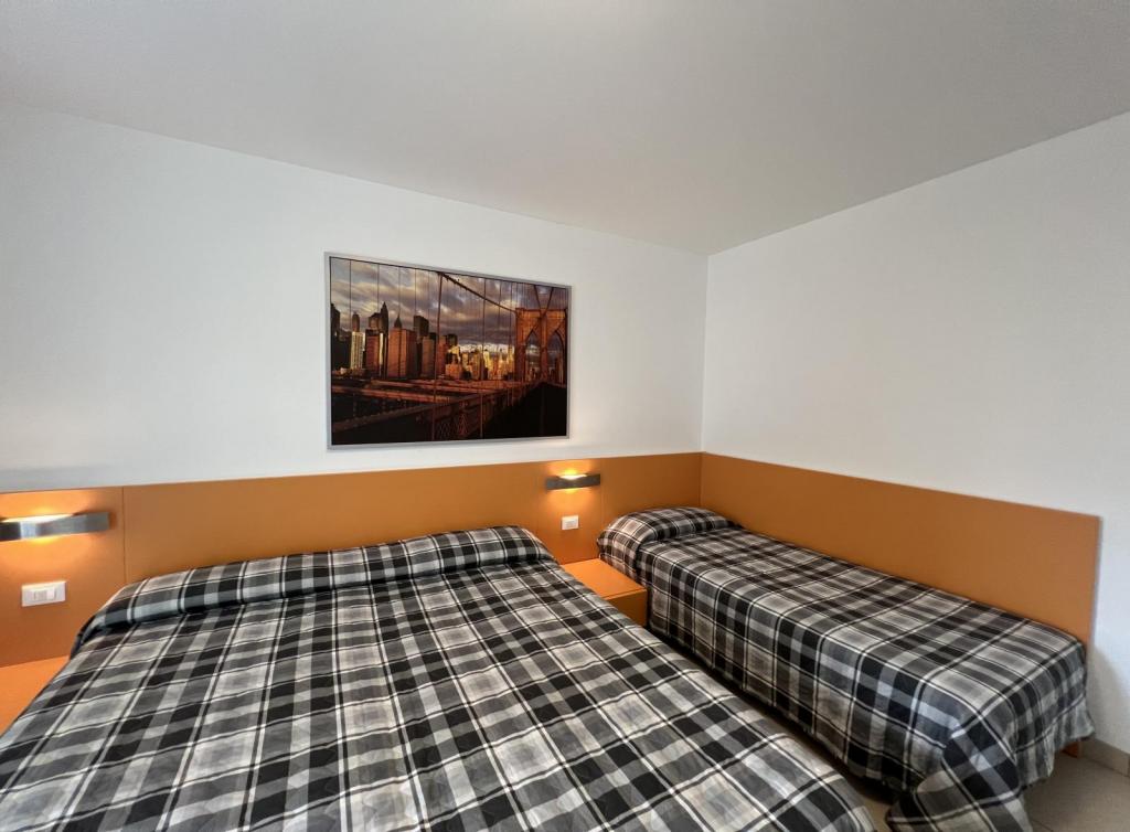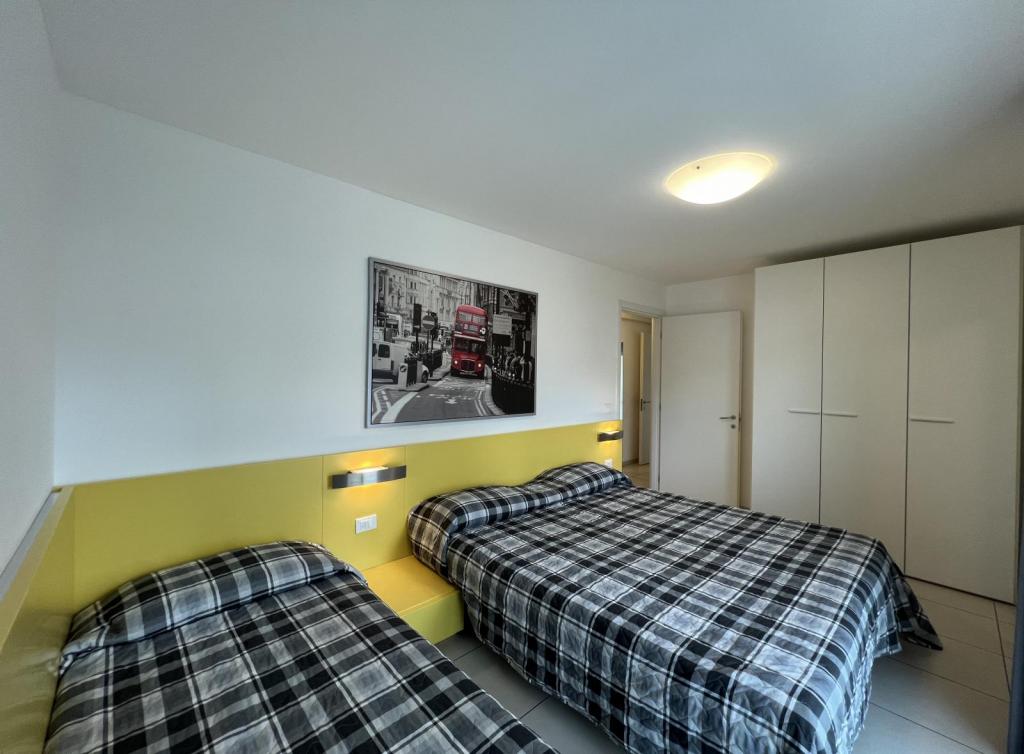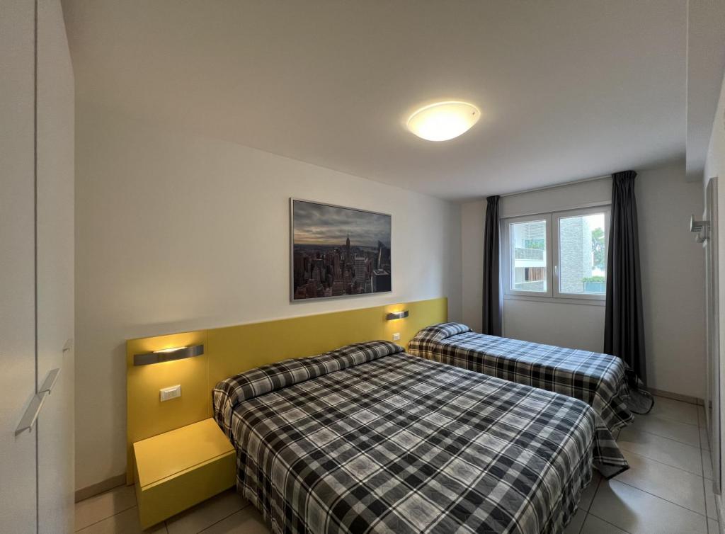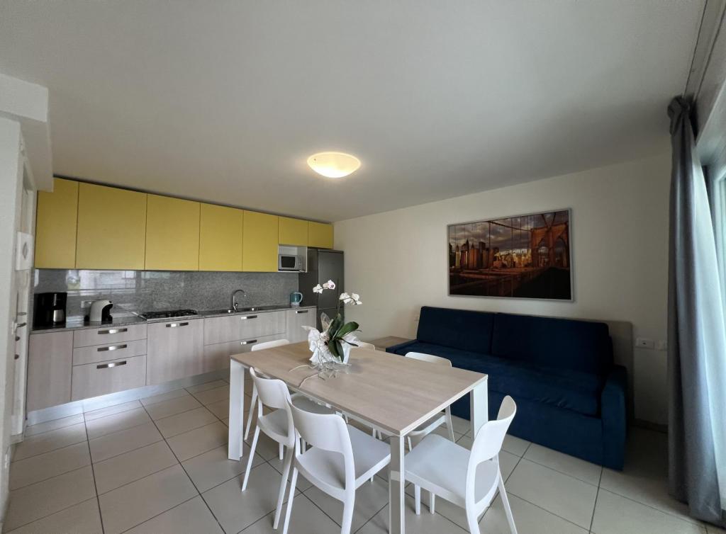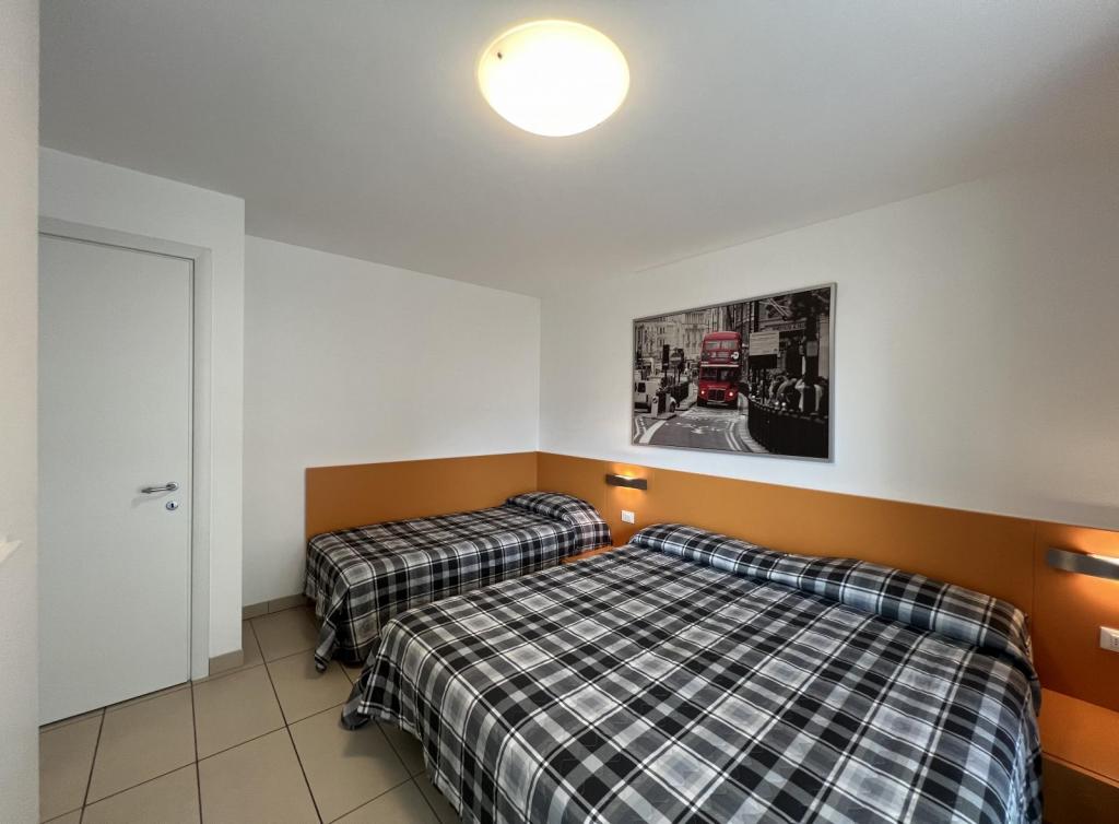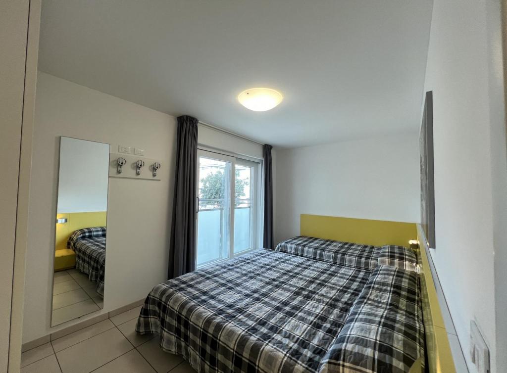 Tipo C7. Appartamento al piano terra. Ingresso indipendente. Soggiorno con angolo cottura e divano letto doppio, camera tripla, camera a due letti, bagno con box doccia. Senza terrazzo. Max 7 pax.