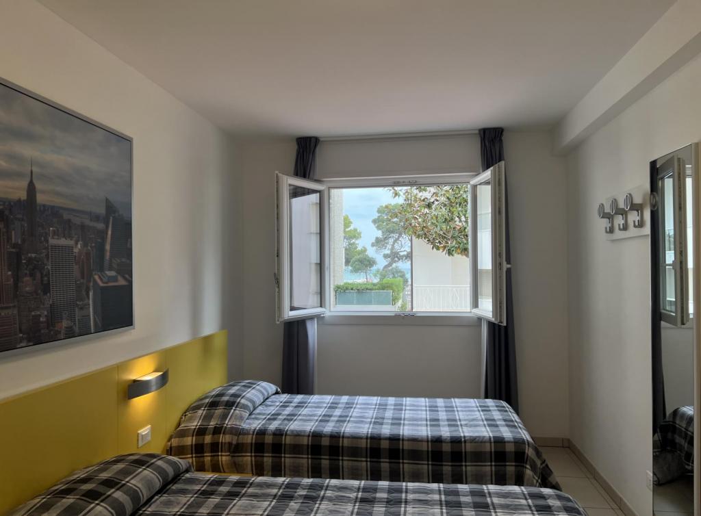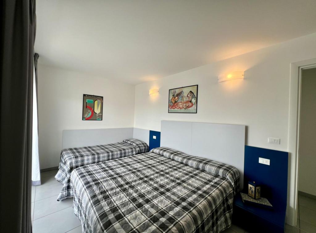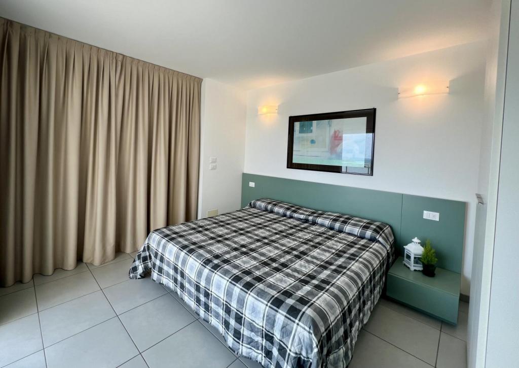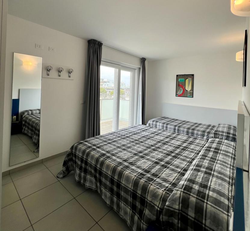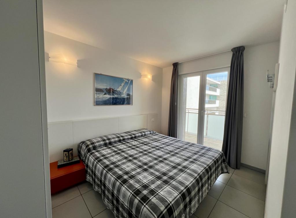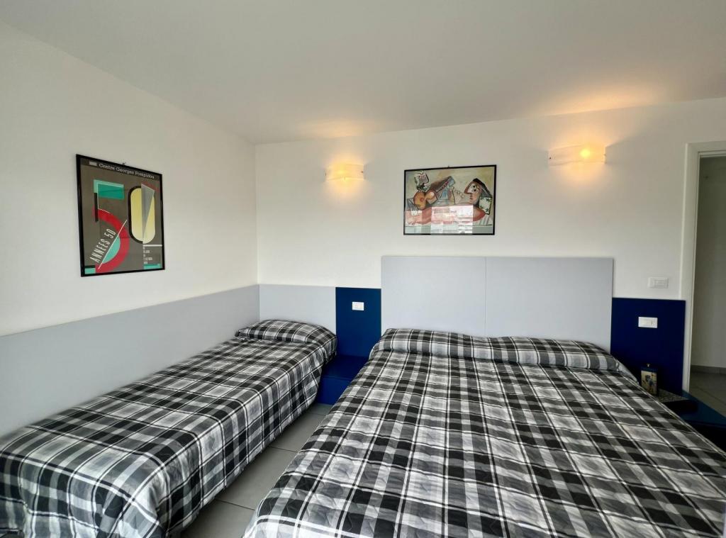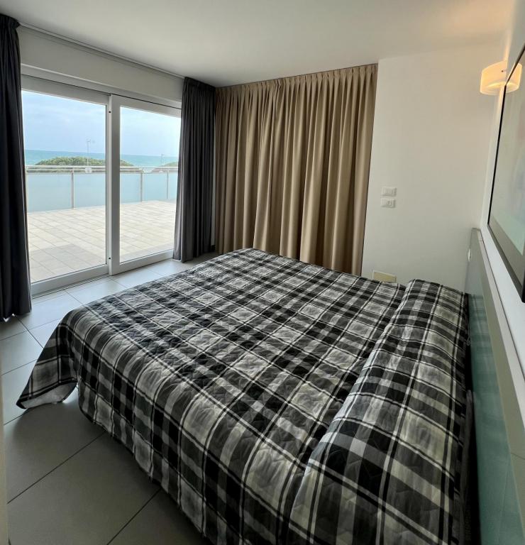 Tipo CX8. Attico. Soggiorno con angolo cottura e zona pranzo, divano letto, camera tripla (letto matrimoniale + letto singolo), 2 camere matrimoniali, 2 bagni con box doccia, ampio balcone panoramico con vista mare e attrezzato con mobili per poter pranzare. Max 8 pax.