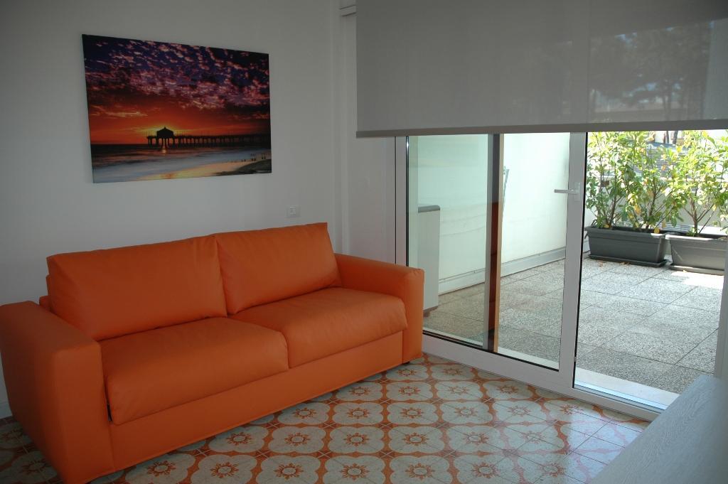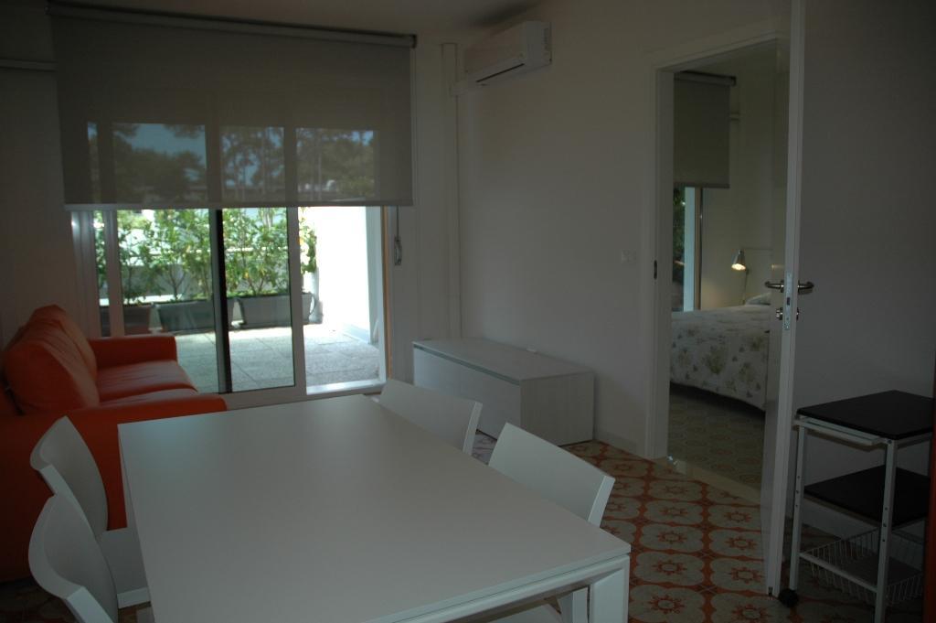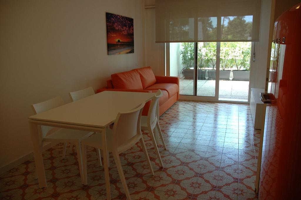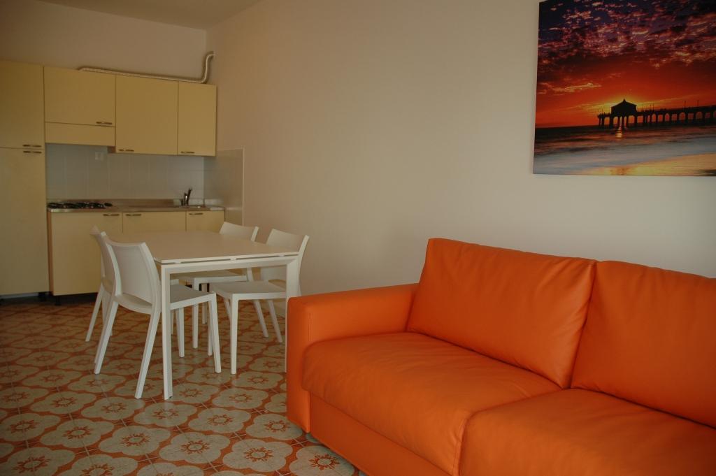 Tipo B1: appartamento rinnovato con soggiorno-pranzo con divano letto e angolo cottura, 1 bagno con doccia, 2 wc. zona notte con letto matrimoniale e letto a castello divisi da porta scorrevole, ampio terrazzo d'angolo. Per 4-5 persone. Indicato per famiglie con bambini - aria condizionata.