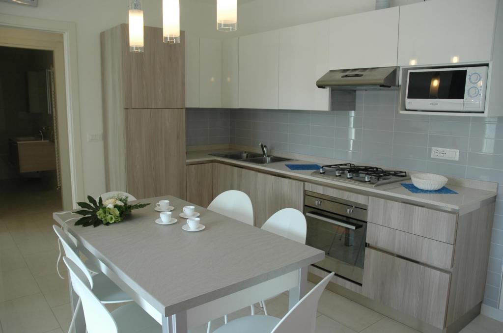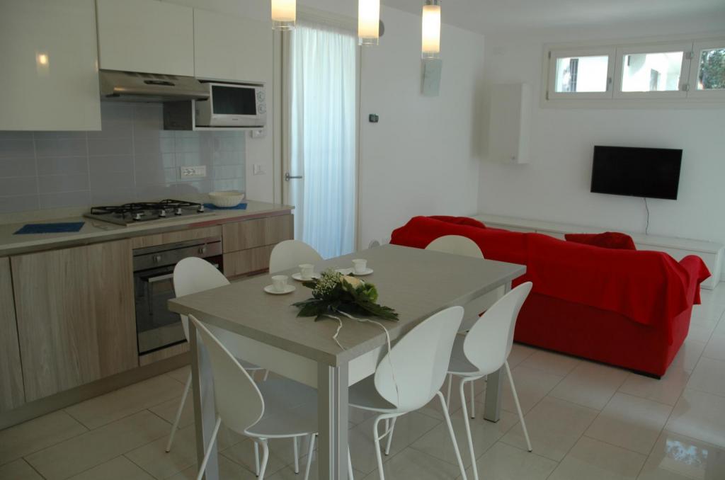 Tipo E: al piano superiore ampio e luminoso soggiorno-pranzo con cucina open space, 1 bagno con vasca, 1 camera matrimoniale, 1 camera con due letti singoli, terrazzo; al piano inferiore 2 camere con 2 letti singoli ciascuna, 1 bagno con doccia, ampio terrazzo, garage e lavanderia. Tetto piatto con solarium. Per 8 persone. Arredamento moderno - lavastoviglie - lavatrice - forno a microonde - TV - aria condizionata.