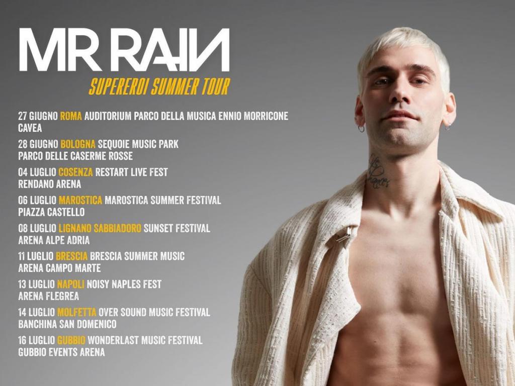 Vi aspettiamo per il grande concerto di Mr Rain a Lignano Sabbiadoro! salva la data, sabato 8 Luglio 2023 alle ore 21.30, presso l’Arena Alpe Adria. Dopo il grande successo ottenuto alla 73° edizione del festival di Sanremo, e dopo aver ottenuto il 3° posto, avremo l’occasione di avere con noi, uno dei cantanti più ascoltati del momento. Ancora adesso Il brano “Supereroi”, ormai disco di platino, si posiziona ai vertici di tutte le classifiche delle radio Italiane, ma anche nelle classifiche online e su Spotify dove ha già superato i 21M di stream. Sulla piattaforma Youtube ha già superato i 13 Milioni di views! Mr Rain e “Supereroi Summer Tour” vi aspettano in una sera di calda estate per cantare assieme i capolavori di questo grande rapper. Ricordiamo che in sole 2 settimane dall’uscita, il singolo ha venduto oltre 100.000, aggiudicandosi il disco di platino.