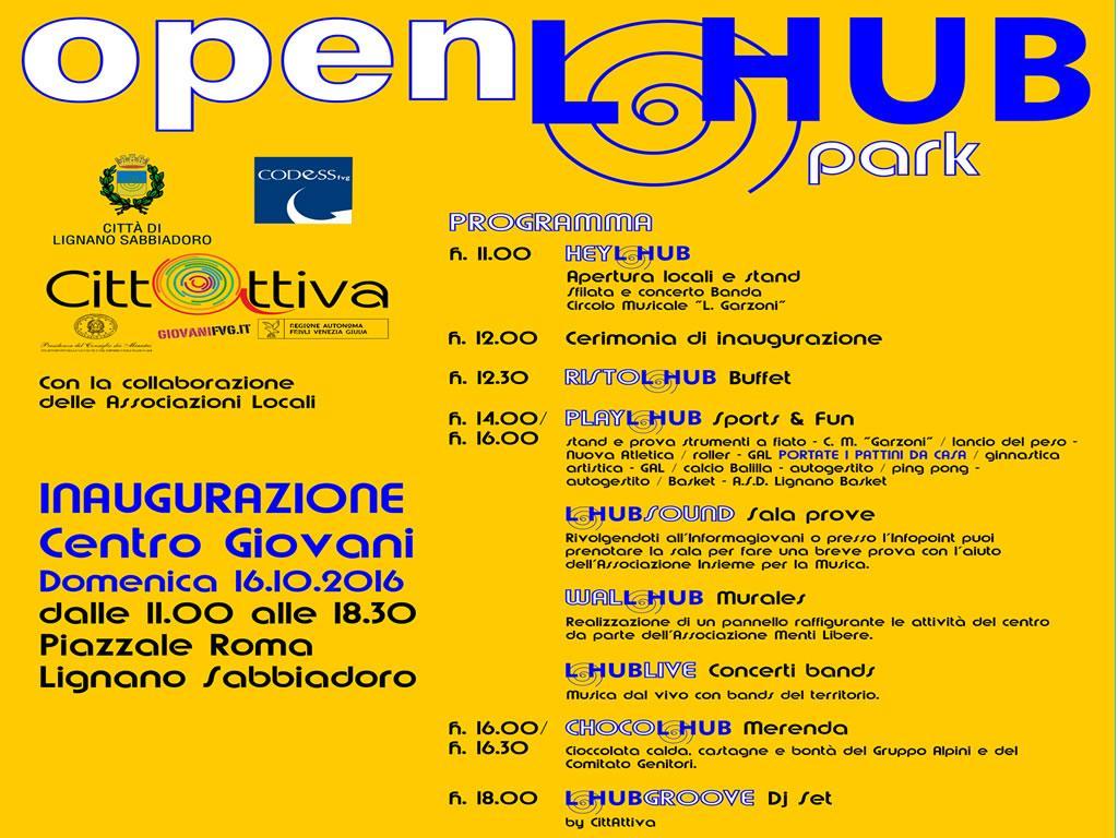 Il Centro Giovani è situato presso il L. HUB Park (ex Impianto Base in Piazzale Roma, accanto alla Polizia Locale). La nuova sede, ampiamente ristrutturata, consta di un ufficio Informagiovani con sala di consultazione, una sala polifunzionale attrezzata con videoproiettore e una sala prove per la musica dotata di strumentazione. Il nome L. HUB – in cui la lettera L è acronimo di Lignano e la parola inglese hub significa perno, centro di una ruota, ma letto insieme suona anche come “lab” (laboratorio) – è stato scelto dai ragazzi per designare un punto di ritrovo, un “laboratorio di idee” dove dare sfogo alla propria creatività e coltivare i propri interessi.