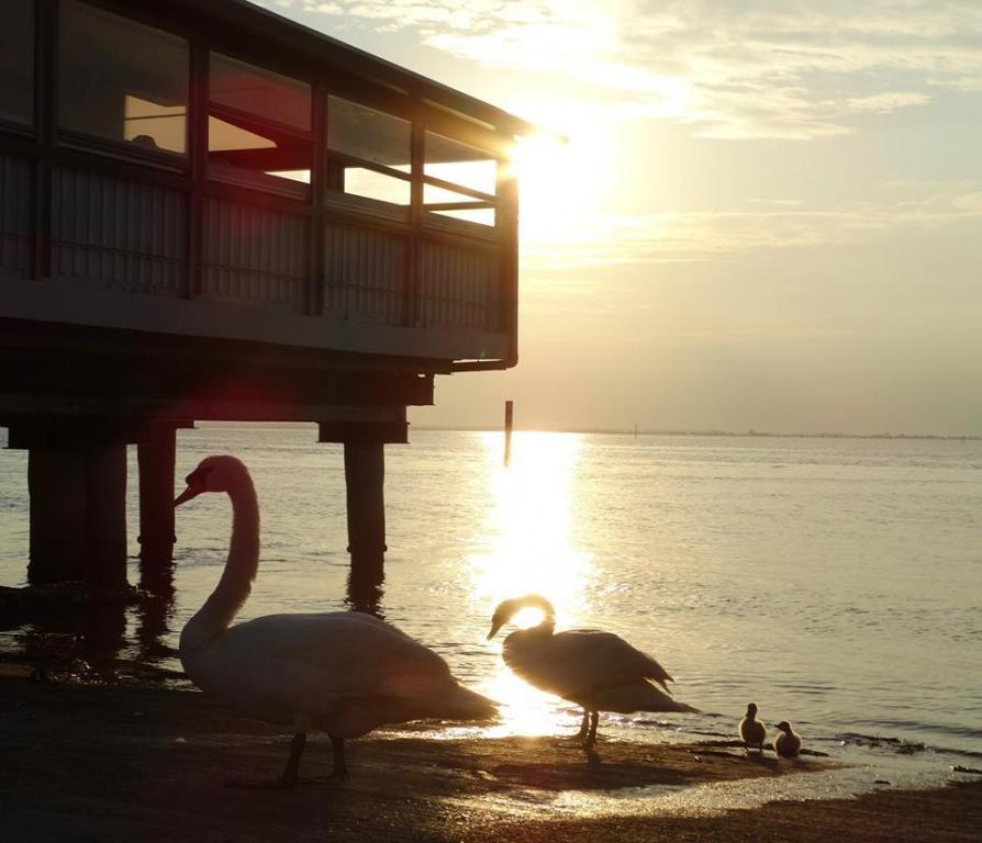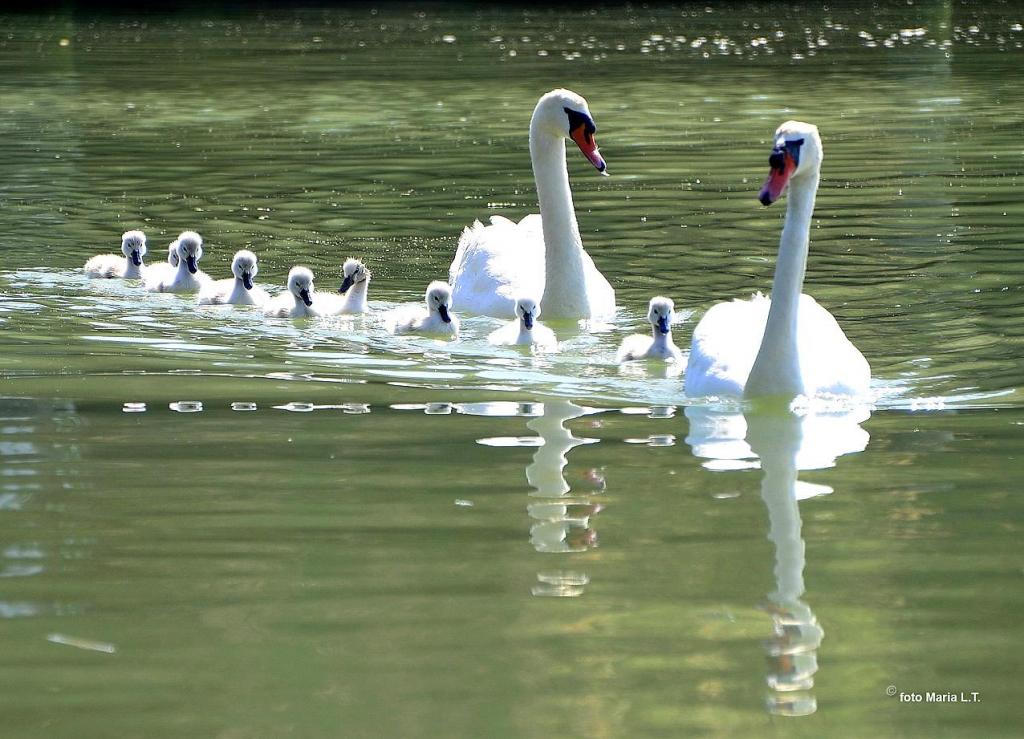 Nella foto una coppia di cigni bianchi a Lignano con ben 9 piccoli esemplari, sembrano i dominatori della laguna, scorrazzano in lungo e in largo, ma per ora tenuti a bada da coloro che li hanno messi al mondo. Sono 9 come i componenti della pattuglia acrobatica nazionale, con una grande differenza che i cigni si godono le tranquille acque della laguna, le frecce tricolori sono i dominatori del cielo. Il nome “Cigno” viene usato spesso in varie maniere: Ristorante al Cigno, Agriturismo ai Cigni, hotel al Cigno e altri ancora.